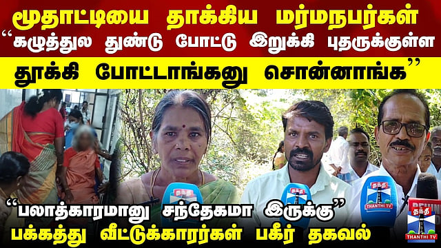 மூதாட்டியை தாக்கிய மர்மநபர்கள் "கழுத்துல துண்டு போட்டு இறுக்கி புதருக்குள்ள தூக்கி போட்டாங்கனு சொன்னாங்க'' ``பலாத்காரமானு சந்தேகமா இருக்கு’' பக்கத்து வீட்டுக்காரர்கள் பகீர் தகவல்
