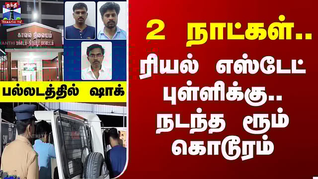 Palladam | TN Police | 2 நாட்கள்.. ரியல் எஸ்டேட் நபருக்கு.. நடந்த ரூம் கொடூரம் - பல்லடத்தில் பகீர் திருப்பூர் மாவட்டம், பல்லடம் அருகே கொடுத்த கடனுக்கு வட்டி கேட்டு, ரியல் எஸ்டேட் தொழில் செய்பவரை அறையில் அடைத்து வைத்து தாக்கிய சம்பவத்தில், 3 பேரை போலீசார் கைது செய்துள்ளனர். கணபதிபாளையத்தை சேர்ந்த உதயகுமார் ரியல் எஸ்டேட் தொழில் செய்து வரும் நிலையில், பல்லடத்தைச் சேர்ந்த சதீஷ்குமார் என்பவரிடம் ஒரு கோடியே 10 லட்சம் ரூபாய் கடன் பெற்றுள்ளார். இதில் ஒரு கோடி ரூபாயை திரும்ப கொடுத்த உதயகுமார், மீதமுள்ள 10 லட்சத்தையும், வட்டித் தொகையையும் பாக்கி வைத்துள்ளார். இந்நிலையில், ரியல் எஸ்டேட் இடம் பார்க்க செல்லலாம் என, உதயகுமாரையும் அவரது நண்பரையும் அழைத்து சென்ற சதீஷ்குமார், தொண்டாமுத்தூரில் அறையில் அடைத்து வைத்து 2 நாட்களாக தாக்கியதாக கூறப்படுகிறது. போலீஸ் உதவி எண்ணுக்கு அழைத்து, இதுகுறித்து உதயகுமார் தகவல் கூறியதை அடுத்து விரைந்து சென்ற போலீசார், உதயகுமாரையும் அவரது நண்பரையும் மீட்டனர். மேலும், சதீஷ்குமார் மற்றும் அவரது கூட்டாளிகள் 2 பேரையும் போலீசார் கைது செய்தனர்.