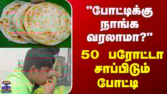 "போட்டிக்கு நாங்க வரலாமா?" - 50 பரோட்டா சாப்பிடும் போட்டி 50 பரோட்டா சாப்பிடும் போட்டி - போட்டிப்போட்டு பொதுமக்கள் பங்கேற்பு புதுக்கோட்டை திலகர் திடல் அருகே உள்ள செட்டிநாடு உணவகத்தில் 50 பரோட்டா போட்டி நடைபெற்றது. இதில் புரோட்டா சாப்பிடுபவர்களுக்கு 5 ஆயிரத்து 1ரூபாய் பரிசு, 500 ஊக்கத்தொகையுடன் 5ஆயிரத்து 501 ரூபாய் பரிசு தொகை வழங்கப்படும் என கடை முன்பு விளம்பர பலகை வைத்து விளம்பரப்படுத்தபட்டது.