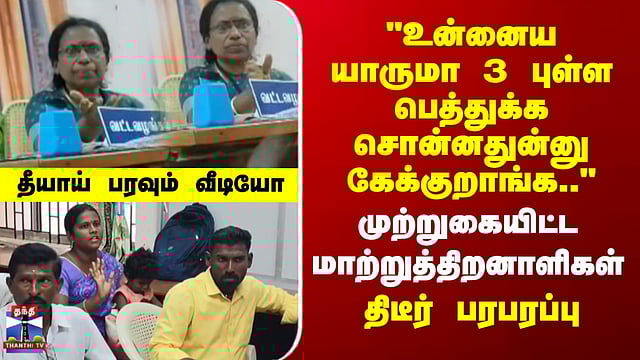 "உன்னைய யாருமா 3 புள்ள பெத்துக்க சொன்னதுன்னு கேக்குறாங்க.." - முற்றுகையிட்ட மாற்றுத் திறனாளிகள்.. பரபரப்பு #Sivaganga #protest #thanthitv வட்டாட்சியர் அலுவலகத்தை முற்றுகையிட்ட மாற்றுத் திறனாளிகள் சிவகங்கை மாவட்டம் திருபப்த்தூர் வட்டாட்சியர் அலுவலகத்தில், தாயுமானவர் திட்டத்தில் ரேஷன் பொருட்கள் வழங்க வேண்டும் என்று மனு அளிக்க வந்த மாற்றுத்திறனாளியின் மனைவியை, வட்ட வழங்கல் அலுவலர் தரக்குறைவாக பேசியதாக, வட்டாட்சியரிடம் புகார் அளிக்கப்பட்டுள்ளது. மணு அளிக்கச் சென்றபோது குழந்தைகள் பெற்றுக்கொண்டது குறித்து வட்ட வழங்கல் அலுவலர் கேள்வி எழுப்பியதாக பாதிக்கப்பட்ட பெண் புகார் தெரிவித்துள்ளார்...