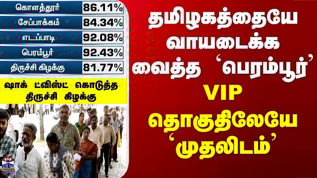 #tnelection2026 #perambur தமிழகத் தேர்தலின் நட்சத்திரத் தொகுதிகளாகக் கருதப்படும் விஐபிக்கள் களம் காணும் தொகுதிகளில் வாக்குப்பதிவு மிக விறுவிறுப்பாக நடைபெற்றுள்ளது. அந்த வகையில், கொளத்தூர் தொகுதியில் 86.11 சதவீதமும், சேப்பாக்கம் தொகுதியில் 84.34 சதவீதமும் வாக்குகள் பதிவாகியுள்ளன. எடப்பாடி தொகுதியில் 92.08 சதவீதமும், பெரம்பூர் தொகுதியில் 92.43 சதவீதமும் வாக்குகள் பதிவாகி ஆச்சரியத்தை ஏற்படுத்தியுள்ளன. திருச்சி கிழக்கு தொகுதியில் 81.77 சதவீத வாக்குகள் பதிவாகியுள்ளன. தேனியின் போடிநாயக்கனூர் தொகுதியில் 82.83 சதவீதமும், சென்னையின் மயிலாப்பூர் தொகுதியில் 74.81 சதவீதமும் வாக்குப்பதிவு எட்டப்பட்டுள்ளது. சாத்தூர் தொகுதியில் 85.74 சதவீதமும், விருத்தாசலத்தில் 86.20 சதவீதமும், தருமபுரியில் 89.44 சதவீதமும் வாக்குகள் பதிவாகியுள்ளன. திருப்பூர் மாவட்டத்தின் அவிநாசி தொகுதியில் 90.57 சதவீதமும், கோவை தெற்கு தொகுதியில் 82.14 சதவீதமும் வாக்குப்பதிவு நடைபெற்றுள்ளது. கோபிசெட்டிப்பாளையம் தொகுதியில் 90.74 சதவீதமும், விருதுநகரில் 82.77 சதவீதமும், கோவை வடக்கு தொகுதியில் 75.67 சதவீதமும் வாக்குகள் பதிவாகியுள்ளன. சிவகங்கை மாவட்டத்தின் காரைக்குடி தொகுதியில் 74.17 சதவீதமும், தொண்டாமுத்தூர் தொகுதியில் 87.54 சதவீதமும் வாக்குகள் பதிவாகியுள்ளன. திண்டுக்கல் தொகுதியில் சரியாக 86 சதவீதமும், சென்னையின் திரு.வி.க நகர் தொகுதியில் 78.70 சதவீதமும் வாக்குப்பதிவு நடந்துள்ளது. லால்குடி தொகுதியில் 86.51 சதவீத வாக்குகள் பதிவாகி உள்ளது.