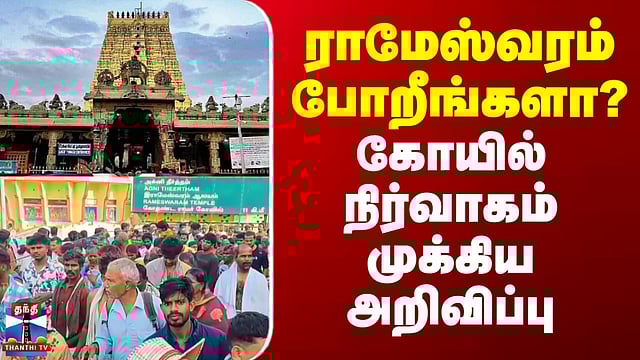 Rameshwaram Temple | sivaratri | ராமேஸ்வரம் போறீங்களா? - கோயில் நிர்வாகம் முக்கிய அறிவிப்பு நாளை ராமேஸ்வரம் ராமநாதசுவாமி கோயில் நடை அடைப்பு மகா சிவராத்திரி திருவிழாவை முன்னிட்டு, ராமேஸ்வரம் ராமநாதசுவாமி திருக்கோயிலின் நடை செவ்வாய்கிழமையன்று அடைக்கப்படும் என கோயில் நிர்வாகம் அறிவித்துள்ளது. கெந்தமாதன பர்வதம் மண்டகப்படிக்கு சாமி புறப்பாடு நடைபெறுவதால், காலை 7 மணி முதல் இரவு 10 மணி வரை கோயில் நடை மூடப்படும். இதனை கருத்தில் கொண்டு, பக்தர்கள் தங்களின் வருகையை அதற்கேற்றவாறு திட்டமிட வேண்டும் என கோயில் நிர்வாகம் தெரிவித்துள்ளது.