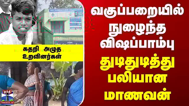 Snake Bite | Student | School | வகுப்பறையில் நுழைந்த விஷப்பாம்பு - துடிதுடித்து பலியான மாணவன் வலங்கைமான் - பள்ளியில் பாம்பு கடித்ததில் மாணவன் பலி திருவாரூர் மாவட்டம் வலங்கைமான் அருகே அரசுப் பள்ளியில், பாம்பு கடித்து 11 ஆம் வகுப்பு மாணவன் உயிரிழந்த சம்பவம் அதிர்ச்சியை ஏற்படுத்தி உள்ளது. வலங்கைமான் அடுத்துள்ள அரிதுவரமங்கலம் அரசு மேல்நிலைப் பள்ளியில் 11 ஆம் வகுப்பு படித்து வந்த சிவப்பிரகாஷ் என்ற மாணவன், வகுப்பறையில் புத்தகத்தை எடுத்த போது விஷப் பாம்பு தீண்டியுள்ளது. இதனால் அதிர்ச்சி அடைந்த சக மாணவர்கள் மற்றும் ஆசிரியர்கள் சிவப்பிரகாஷை அருகில் உள்ள ஆரம்ப சுகாதார நிலையத்திற்கு அழைத்துச் சென்றனர். பின்னர் மேல் சிகிச்சைக்காக தஞ்சை அரசு மருத்துவக் கல்லூரி மருத்துவமனையில் அனுமதிக்கப்பட்ட சிவப்பிரகாஷிற்கு தொடர்ந்து சிகிச்சை அளிக்கப்பட்டு வந்தது. இந்தநிலையில், இன்று அதிகாலை சிவப்பிரகாஷ் சிகிச்சை பலனின்றி உயிரிழந்துள்ளார். பள்ளியில் வகுப்பறையில் விஷ பாம்பு கடித்து மாணவன் பரிதாபமாக உயிரிழந்து, அப்பகுதி மக்களிடையே பெரும் அதிர்ச்சியும் வேதனையும் ஏற்படுத்தியுள்ளது.