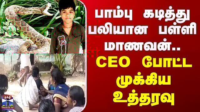 பாம்பு கடித்து பலியான பள்ளி மாணவன்.. CEO போட்ட முக்கிய உத்தரவு பாம்பு கடித்து பள்ளி மாணவர் உயிரிழப்பு - விசாரணைக்கு சிஇஓ உத்தரவு திருவாரூர் அருகே பாம்பு கடித்து பள்ளி மாணவர் உயிரிழந்த விவகாரத்தில், விசாரணைக்கு சிஇஓ உத்தரவு பிறப்பித்தார்.