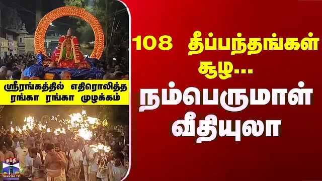 108 தீப்பந்தங்கள் சூழ நம்பெருமாள் வீதியுலா ஸ்ரீரங்கம் அரங்கநாதசுவாமி கோவில் மாசித் தெப்பத்திருவிழாவின் சிகர நிகழ்ச்சியாக, பந்தகாட்சி கோலாகலமாக நடைபெற்றது. ஒற்றை பிரபை வாகனத்தில் 108 தீப்பந்தங்கள் சூழ நம்பெருமாள் எழுந்தருளி சித்திரை வீதிகளில் வீதி உலா வந்தார். இதனை ஏராளமான பக்தர்கள் ரங்கா ரங்கா என முழக்கமிட்டு பக்தி பரவசத்துடன் தரிசனம் செய்தனர்.