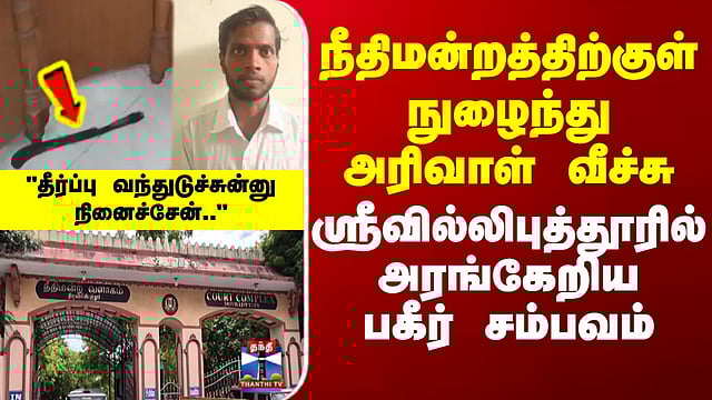Srivilliputhur | Court Complex | நீதிமன்றத்திற்குள் நுழைந்து அரிவாள் வீச்சு - ஸ்ரீவில்லிபுத்தூரில் பகீர் சம்பவம் ஸ்ரீவில்லிபுத்தூர் மாவட்ட நீதிமன்றத்தில் அரிவாளை வீசிய சம்பவம் பெரும் பரபரப்பை ஏற்படுத்தியுள்ளது. செங்குளம் கிராமத்தைச் சேர்ந்த பாலமுருகன் என்பவரின் மனைவி தொடர்ந்த விவகாரத்து வழக்கு நாளை விசாரணைக்கு வர உள்ள நிலையில், நீதிமன்ற வளாகத்திற்குள் அத்துமீறி நுழைந்து அரிவாளை வீசியதாக கூறப்படுகிறது. இதையடுத்து, நீதிமன்றத்தில் பாதுகாப்பில் இருந்த போலீசார் உடனடியாக பாலமுருகனை பிடித்து காவல் நிலையத்திற்கு அழைத்துச் சென்றனர். நீதிமன்ற ஊழியர் அளித்த புகாரின் பேரில் பாலமுருகன் மீது வழக்குப் பதிவு செய்து போலீசார் தீவிர விசாரணை மேற்கொண்டு வருகின்றனர். விசாரணையில், பாலமுருகனுக்கு எதிரான ஜீவனாம்சம் தொடர்பான வழக்கில் நாளை தீர்ப்பு வழங்க உள்ள நிலையில், தீர்ப்பு வழங்கி விட்டதாக நினைத்து நீதிமன்றத்திற்கு வந்து அரிவாளை வீசியது தெரிய வந்துள்ளது.