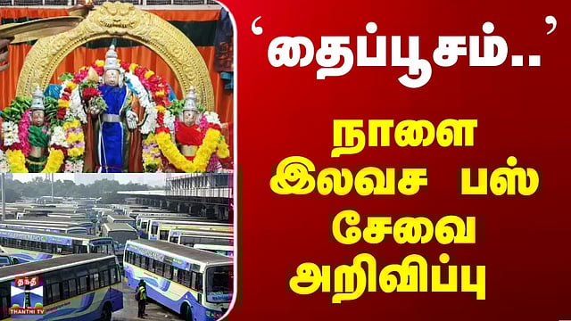 Thaipoosam | Bus | Lord Murgan | `தைப்பூசம்..' - நாளை இலவச பேருந்து சேவை அறிவிப்பு #Thaipoosam #Bus #LordMurugan #Tirutani திருத்தணி முருகன் கோயிலில் தைப்பூசத்தை முன்னிட்டு பக்தர்கள் வசதிக்காக நாளை காலை 5 மணிமுதல் இரவு வரை 15 இலவச சிறப்பு பேருந்துகள் இயக்கப்பட உள்ளன. இட வசதிக்கு ஏற்ப கார்கள், டூவீலர்கள் அனுமதிக்கப்படும் என்றும், போக்குவரத்து நெரிசலை தடுக்கும் வகையில் ஆட்டோக்கள் செல்ல தடை விதிக்கப்பட்டுள்ளதாகவும் தெரிவிக்கப்பட்டுள்ளது.