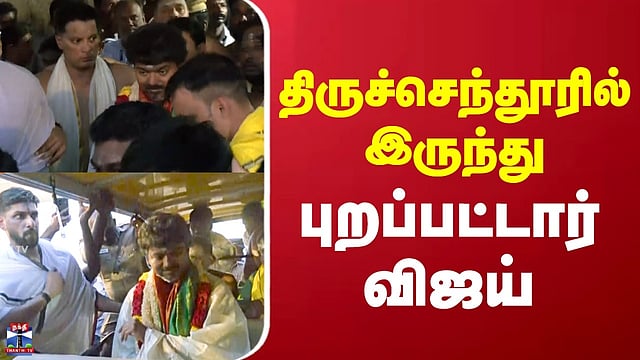 திருச்செந்தூர் தரிசனத்திற்கு பின் சென்னை புறப்பட்ட விஜய் தூத்துக்குடியிலிருந்து விமானம் மூலம் சென்னை வரும் விஜய் திருச்செந்தூரில் சுவாமி தரிசனம் செய்த தவெக தலைவர் விஜய், சென்னை புறப்பட்டார்...