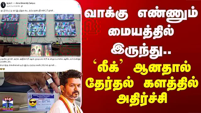 வாக்கு எண்ணும் மைய கட்டுப்பாட்டு அறையின் புகைப்படம் வெளியிட்ட விவகாரம் சென்னை அண்ணா பல்கலைக்கழக வாக்கு எண்ணும் மையத்தின் கட்டுப்பாட்டு அறையில் இருந்த தொழில்நுட்பப் பணியாளர் யுவராஜ், தேர்தல் பாதுகாப்பு விதிகளை மீறி செயல்பட்டதால் அவர் மீது புகார் அளிக்க நடவடிக்கை எடுக்கப்பட்டுள்ளது. யுவராஜ் அங்குள்ள மடிக்கணினியில் நடிகரும், தவெக தலைவருமான விஜய்யின் ஜனநாயகன் படத்தை சட்டவிரோதமாகப் பார்த்ததோடு, அதனைப் புகைப்படமாக எடுத்து சமூக வலைதளத்திலும் பதிவிட்டுள்ளார். கடந்த 23-ஆம் தேதி வாக்குப்பெட்டிகள் வைக்கப்படுவதற்கு முன்பாக இந்தச் சம்பவம் நடந்துள்ளது. வாக்கு எண்ணும் மையத்தின் கட்டுப்பாட்டு அறையின் புகைப்படம் வெளியானது தேர்தல் ஆணையத்தின் கவனத்திற்குச் சென்றுள்ளது. மேலும் சம்பந்தப்பட்ட நபர் மீது சென்னை காவல்துறையில் புகார் அளிக்க நடவடிக்கை எடுக்கப்பட்டுள்ளது.
