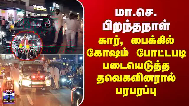 TVK | மாவட்ட செயலாளர் பிறந்தநாள் - கார், பைக்கில் கோஷம் போட்ட படி படையெடுத்த தவெகவினரால் பரபரப்பு மாவட்ட செயலாளர் பிறந்தநாள் - த.வெ.க.வினரின் அட்ராசிட்டியால் பரபரப்பு திருவண்ணாமலை மாவட்டம் வந்தவாசியில், தவெக மாவட்ட செயலாளரின் பிறந்த நாளை ஒட்டி, அக்கட்சியின் தொண்டர்கள் பொதுமக்களுக்கு இடையூறு அளிக்கும் வகையில் அட்ராசிட்டியில் ஈடுபட்டதால் பரபரப்பான சூழல் நிலவியது. திருவண்ணாமலை கிழக்கு மாவட்ட தவெக செயலாளராக இருப்பவர் உதயகுமார். இவரது பிறந்தநாளை ஒட்டி, வந்தவாசி ஐந்து கண் பாலம் அருகே, ஏராளமான தவெகவினர் பைக்குகளில் குவிந்துள்ளனர்.. அப்போது, கிரேன் மூலம் உதயகுமாருக்கு பிரமாண்ட மாலை அணிவிக்கப்பட்டது. ’ தொடர்ந்து, பைக்குளில் சத்தமாக ஹார்ன் அடித்ததால், அங்கு பரபரப்பான சூழல் நிலவியதை அடுத்து, இடையூறாக உள்ள வாகனங்களை எடுக்குமாறு போலீசார் கூறியதால் தவெகவை சேர்ந்த சிலர் வாக்குவாதம் செய்தனர். வழிநெடுகிலும் பட்டாசு வெடித்த படி தவெக தொண்டர்கள் சென்றனர். அப்போது, தவெக மாவட்ட செயலாளர் உதயகுமார் கையில் பட்டாசை பிடித்தும், வாளை சுழற்றியும் கார் மேல் நின்ற காட்சியும் வெளியாகி உள்ளது. இந்த பரபரப்புகளால் வந்தவாசியில் கடும் போக்குவரத்து நெரிசல் ஏற்பட்டது.
