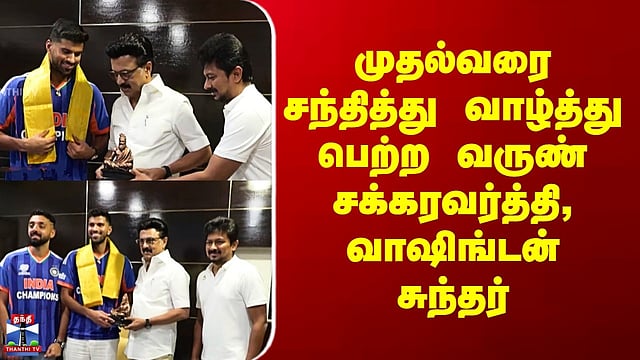 CM Stalin | முதல்வரை சந்தித்து வாழ்த்து பெற்ற வருண் சக்கரவர்த்தி, வாஷிங்டன் சுந்தர் #cmstalin #washingtonsundar #varunchakaravarthy #thanthitv டி20 உலக கோப்பையை வென்ற இந்திய அணியில் இடம்பெற்ற தமிழக வீரர்கள் வருண் சக்கரவர்த்தி மற்றும் வாஷிங்டன் சுந்தர் முதலமைச்சர் ஸ்டாலினை நேரில் சந்தித்து வாழ்த்து பெற்றனர்...