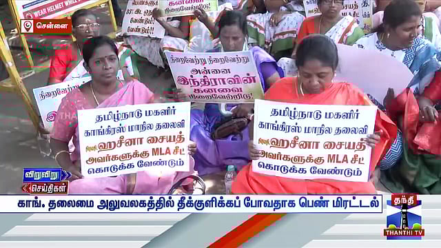 காங்கிரஸ் தலைமை அலுவலகமான சத்தியமூர்த்தி பவனில் சட்டமன்ற தேர்தலை முன்னிட்டு வேட்பாளர் அறிவிப்பு தாமதமாகும் நிலையில், அக்கட்சியின் சேவாதளம் அமைப்பு சார்பில் விஜயனுக்கு எம்எல்ஏ சீட் வழங்க கோரி தொண்டர்கள் போராட்டத்தில் ஈடுபட்டனர். அப்போது ஒரு பெண் டீசல் கேன் எடுத்துக்கொண்டு, சீட் வழங்கவில்லை என்றால் தீக்குளிப்பேன் என மிரட்டியதால் பரபரப்பு ஏற்பட்டது. உடனடியாக நிர்வாகிகள் அவரை சமாதானப்படுத்தினர். இதற்கிடையில், மகளிருக்கு 33% இடஒதுக்கீடு வழங்க வேண்டும், மேலும் ஹசீனா செயத்திற்கு கிருஷ்ணகிரி தொகுதியை ஒதுக்க வேண்டும் என 30க்கும் மேற்பட்ட பெண்கள் அலுவலகத்தை முற்றுகையிட்டு போராட்டம் நடத்தினர்.