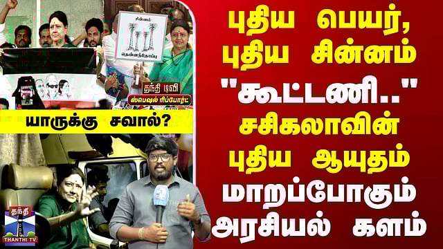கட்சியின் பெயரை அறிவித்த சசிகலா - கூட்டணி அமைத்து தேர்தலை சந்திப்பேன் என திட்டவட்டம் சமீபத்தில் கட்சி கொடியை அறிமுகப்படுத்திய சசிகலா, கட்சியின் பெயர் அனைத்து இந்திய புரட்சித் தலைவர் மக்கள் முன்னேற்றக் கழகம் என்று இன்று அறிவித்தார். தமிழ்நாடு மற்றும் புதுச்சேரியில் தென்னந்தோப்பு சின்னத்தில் போட்டியிடுவோம் என்றும், கூட்டணி அமைத்தே தேர்தலை சந்திப்போம் என்றும் கூறியிருக்கிறார். இதுபற்றி விளக்குகிறார் செய்தியாளர் மணிகண்டன்....
