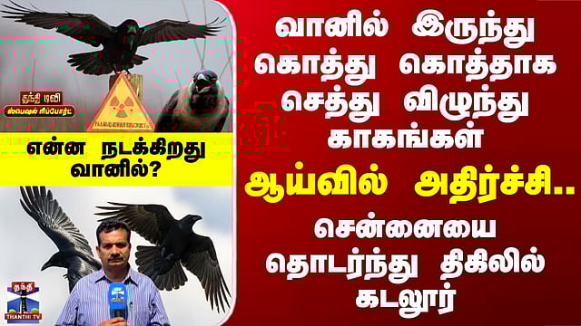 Special Report | கொத்து கொத்தாக செத்து விழுந்து காகங்கள்என்ன நடக்கிறது வானில்..? ஆய்வில் அதிர்ச்சி.. அண்மையில் சென்னையில் காகங்கள் மர்மமான முறையில் உயிரிழந்ததை தொடர்ந்து மேற்கொள்ளப்பட்ட ஆய்வில் காகங்களுக்கு பறவைக் காய்ச்சல் பாதிப்பு இருப்பது உறுதி செய்யப்பட்டது. இந்தநிலையில், கடலூர் கங்கணாங்குப்பம் ஊராட்சியில் 50க்கும் மேற்பட்ட காகங்கள் மயங்கி விழுந்து உயிரிழந்தது அதிர்ச்சிய ஏற்படுத்தி இருக்கு. காகங்கள் உயிரிழப்பு தொடர்பாக அதிகாரிகள் ஆய்வு செய்ய மாவட்ட ஆட்சியர் உத்தரவிட்டுருக்காரு. இதனால் அப்பகுதி மக்கள் பீதி அடைந்துள்ளனர். விவரங்களுடன் இணைகிறார் செய்தியாளர் தேவநாதன்...