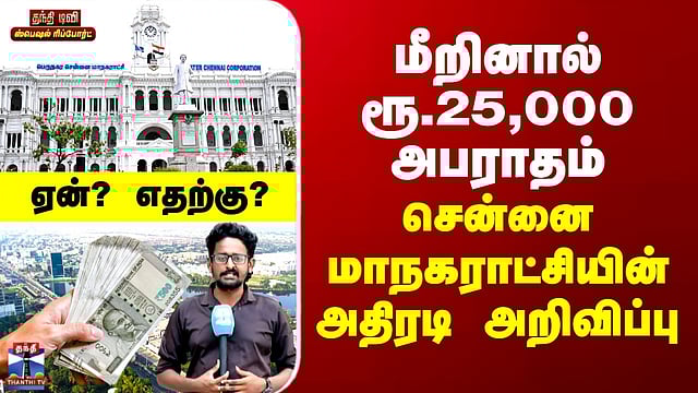 மீறினால் ரூ.25,000 அபராதம் - சென்னை மாநகராட்சியின் அதிரடி அறிவிப்பு சென்னையில் கட்டுமான விதிகளை பின்பற்றாமல் காற்று மாசு ஏற்படுத்தும் வாகனங்களுக்கு 25,000 ரூபாய் அபராதம் விதிக்கப்படும். கட்டுமான பொருட்கள், கட்டுமான கழிவுகள் ஏற்றிச் செல்லும் வாகனங்கள் விதிமுறைகளை முறையாக பின்பற்ற வேண்டும் என சென்னை மாநகராட்சி எச்சரிக்கை விடுத்துள்ளது. இதுபற்றி விளக்குகிறார் செய்தியாளர் தாயுமானவன்...