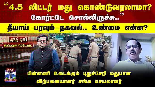 புதுச்சேரியில் இருந்து மதுபானம் கொண்டு வந்தவர் மீதான வழக்கு ரத்து 4.5 லி. வரை மதுபானம் கொண்டுவர அனுமதியா..? - தீயாய் பரவும் தகவல் புதுச்சேரியில் இருந்து ஒருவர் 4.5 லிட்டர் வரை மது கொண்டுவரலாம் என சமூக ஊடகங்களில் தகவல் பரவி வருகிறது. இது உண்மையா? அரசாணையில் இருப்பது என்ன?