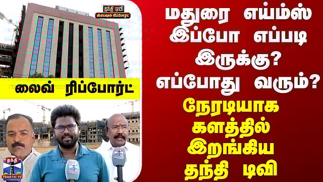 மதுரை எய்ம்ஸ் இப்போ எப்படி இருக்கு? எப்போது வரும்? நேரடியாக களத்தில் இறங்கிய தந்தி டிவி - லைவ் ரிப்போர்ட் மதுரை எய்ம்ஸ் எப்போது வரும்? தற்போதைய நிலவரம் என்ன?/மதுரை தோப்பூர் எய்ம்ஸ் மருத்துவமனையின் கட்டுமானப் பணிகள் குறித்து தந்தி டிவியின் ஸ்பெஷல் ரிப்போர்ட்/அரசியல் விமர்சனமாக முன்வைக்கப்படும் மதுரை எய்ம்ஸ் எப்போது திறக்க வாய்ப்பு?/2018 ஆம் ஆண்டு அறிவிக்கப்பட்டு 2019 ஆம் ஆண்டு ஜனவரி மாதம் பிரதமர் மோடி அடிக்கல் நாட்டிய எய்ம்ஸ்/ரூ.1977.80 கோடி மதிப்பீடு செய்யப்பட்டுள்ள இத்திட்டம், எப்போது செயல்பாட்டிற்கு வரும்?/பிப்ரவரி மாதம் பயன்பாட்டிற்கு வரும் என்கிற தகவல் உண்மையா? களத்தில் இருந்து தந்தி டிவி வழங்கும் ரிப்போர்ட்