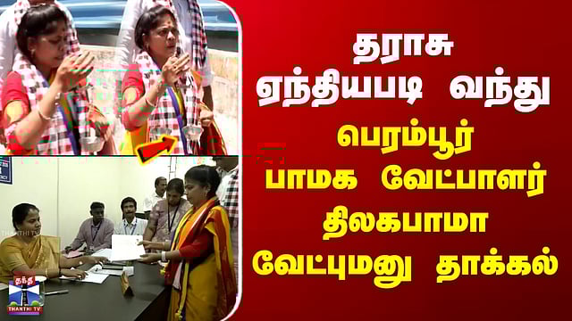 சென்னை பெரம்பூர் தொகுதி பாமக வேட்பாளர் திலகபாமா கையில் தராசு ஏந்தியபடி வந்து நூதன முறையில் வேட்பு மனு தாக்கல் செய்தார். தொடர்ந்து செய்தியாளர்களை சந்தித்த அவர், அடித்தட்டு மக்கள் அதிகம் வாழக்கூடிய இந்த பகுதியில் எந்தவிதமான அடிப்படை வசதிகளும் நிறைவேற்றப்படவில்லை என குற்றம்சாட்டினார். மேலும் தமிழகத்தில் சட்டம் ஒழுங்கு சீர்கேடு, பெண்களுக்கு எதிரான பாலியல் வன்கொடுமை பிரச்சனை அதிகரிப்பு உள்ளிட்ட பிரச்சனைகளுக்கு நீதி கிடைப்பதை உறுதி செய்ய வேண்டும் என்பதை வலியுறுத்தியும், குறிப்பாக ஆம்ஸ்ட்ராங் கொலை வழக்கில் நீதி கேட்டும் தராசு ஏந்தி வந்ததாகவும் குறிப்பிட்டுள்ளார்.