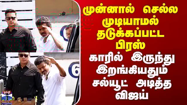 TVK முன்னால் செல்ல முடியாமல் தடுக்கப்பட்ட பிரஸ் - காரில் இருந்து இறங்கியதும் சல்யூட் அடித்த விஜய்