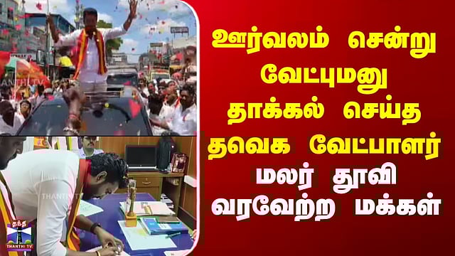 TVK | Nomination | ஊர்வலம் சென்று வேட்புமனு தாக்கல் செய்த தவெக வேட்பாளர் -மலர் தூவி வரவேற்ற மக்கள்