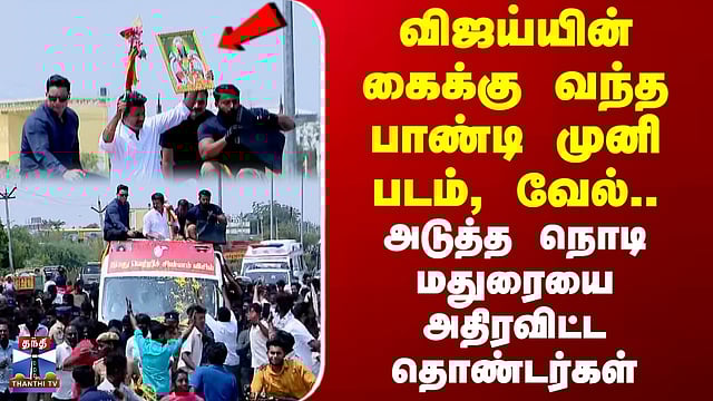 TVK Vijay Madurai Road show | விஜய்யின் கைக்கு வந்த பாண்டி முனி படம்,வேல்..அதிரவிட்ட தொண்டர்கள்