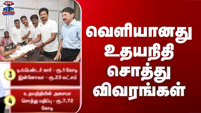 t துணை முதலமைச்சர் உதயநிதி ஸ்டாலின் சொத்து விவரங்கள் வெளியீடு சேப்பாக்கம் - திருவல்லிக்கேணி தொகுதி தி.மு.க வேட்பாளர் உதயநிதி ஸ்டாலின் தாக்கல் செய்துள்ள சொத்து விவரங்கள் வெளியாகியுள்ளன. அதன்படி, அவரிடம் 12.92 கோடி ரூபாய் மதிப்பிலான அசையும் சொத்துகள் இருப்பதாக தெரிவிக்கப்பட்டுள்ளது. அவரது மனைவி கிருத்திகா உதயநிதியிடம் 13.25 கோடி ரூபாய் மதிப்பிலான அசையும் சொத்துகளும் இருப்பதாகத் கூறப்பட்டுள்ளது. குறிப்பாக, உதயநிதியிடம் ஒரு கோடி ரூபாய் மதிப்பிலான டிஃபென்டர் கார் மற்றும் 23 லட்சம் ரூபாய் மதிப்பிலான இன்னோவா கார் என இரண்டு வாகனங்கள் உள்ளதாக குறிப்பிடப்பட்டுள்ளது. அதேபோல உதயநிதியிடம் 7 கோடியே 72 லட்சம் ரூபாய் மதிப்பில் அசையா சொத்துகள் உள்ளதாக வேட்புமனுவில் தெரிவிக்கப்பட்டுள்ளது.