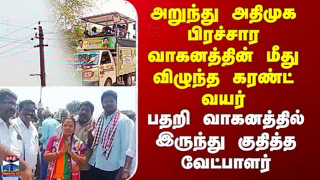 வந்தவாசி அருகே அதிமுக வேட்பாளரின் பிரசார வாகனத்தில் மின்கம்பி அறுந்து விழுந்ததால் பரபரப்பு ஏற்பட்டது.