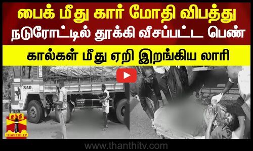 பைக் மீது கார் மோதி விபத்து - நெடுஞ்சாலையில் தூக்கி வீசப்பட்ட பெண் - கால்கள் மீது ஏறி இறங்கிய லாரி
