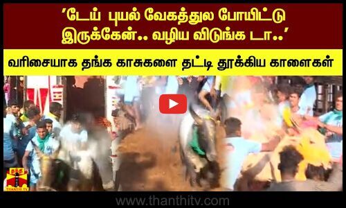 டேய் புயல் வேகத்துல போயிட்டு இருக்கேன்.. வழிய விடுங்க டா.. வரிசையாக தங்க காசுகளை தட்டி தூக்கிய காளைகள்