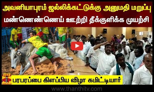 மதுரை மாவட்டத்தில், ஜல்லிக்கட்டு போட்டிகள் நடத்துவது தொடர்பான ஆலோசனைக் கூட்டம், ஆட்சியர் அலுவலகத்தில் நடைபெற்றது. இதில், அமைச்சர் மூர்த்தி, அதிகாரிகள், விழா குழுவினர் உள்ளிட்டோர் பங்கேற்றனர். அப்போது, அவனியாபுரம் ஜல்லிக்கட்டு நடத்த கிராம விழா குழுவினருக்கு அனுமதி மறுக்கப்பட்டதாக தெரிகிறது. இதை கண்டித்த அவனியாபுரம் விழா குழுவினர், அமைச்சர், ஆட்சியருக்கு எதிராக கண்டன முழக்கங்கள் எழுப்பினர். மேலும், உடலில் மண்ணெண்ணெய் ஊற்றி, விழா குழுவினர் தீக்குளிக்க முயன்றதால் பரபரப்பு ஏற்பட்டது. தொடர்ந்து, அவனியாபுரம் ஜல்லிக்கட்டு போட்டியை நடத்த கிராம விழா குழுவினருக்கு அனுமதி அளிக்காதபட்சத்தில், தொடர் போராட்டத்தில் ஈடுபடுவோம் என, எச்சரிக்கை விடுத்துள்ளனர்.