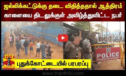 புதுக்கோட்டை மாவட்டம் தச்சங்குறிச்சியில் இன்று நடக்க இருந்த ஜல்லிக்கட்டுக்கு தடை விதிக்கப்பட்ட நிலையில், ஆவேசம் அடைந்த ஒருவர், தனது காளையை திடலுக்குள் அவிழ்த்துவிட்டதால் பரபரப்பு ஏற்பட்டது.