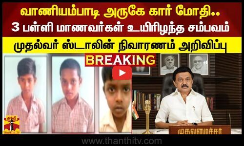 - வாணியம்பாடி அருகே கார் மோதி உயிரிழந்த பள்ளி மாணவர்கள் 3 பேரின் குடும்பத்தினருக்கு, முதலமைச்சர் ஸ்டாலின் இரங்கல் தெரிவித்து நிவாரணம் அறிவிப்பு