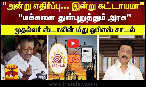 ஆதார் எண்ணை மின் இணைப்புடன் இணைக்கச் சொல்லி மின் நுகர்வோர்களை திமுக அரசு துன்புறுத்துவதாகவும், எனவே அதற்கு கண்டனம் தெரிவிப்பதாக முன்னாள் முதல்வர் ஓ.பன்னீர்செல்வம் கூறியுள்ளார். இது குறித்து அவர் வெளியிட்ட அறிக்கையில், கடந்த ஒன்றரை ஆண்டு கால தி.மு.க. அரசின் "சொல்வது ஒன்று செய்வது ஒன்று" என்றும் இது தான் திராவிட மாடலா என குறிப்பிட்டுள்ளார். ஆதார் எண் இணைப்பிற்கான கால அவகாசத்தை ஆறு மாதத்திற்கு நீட்டிக்க வேண்டும் என்றும் ஓ.பன்னீர்செல்வம் வலியுறுத்தியுள்ளார்.