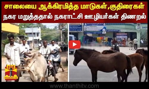 சாலையை ஆக்கிரமித்த மாடுகள்,குதிரைகள் - நகர மறுத்ததால் நகராட்சி ஊழியர்கள் திணறல் | Thiruvarur