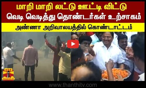 மாறி மாறி லட்டு ஊட்டி விட்டு வெடி வெடித்து தொண்டர்கள் உற்சாகம் - அண்ணா அறிவாலயத்தில் கொண்டாட்டம்