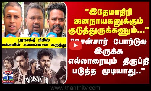 பராசக்தி திரைப்படத்திற்கு சென்சார் சான்று அளிக்கட்டு படம் குறிப்பிட்ட நாளில் வெளியான நிலையில் , அது குறித்து மக்கள் குரல் பகுதியில் எழுப்பப்பட்ட கேள்விகளுக்கு புதுக்கோட்டை மாவட்டம் திருமயம் மக்கள் தெரிவித்த கருத்துக்களைப் பார்க்கலாம்..