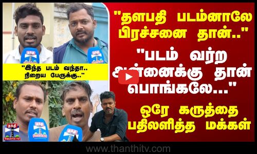 பொங்கலுக்கு ஜனநாயகன் ரிலீஸ் ஆக வாய்ப்பில்லை என கூறப்படும் நிலையில், இந்த ஆண்டு பொங்கல் ரேஸில் விஜய் படம் இல்லாததை எப்படி பார்க்கிறீர்கள் என்று மக்கள் குரல் பகுதியில் எழுப்பப்பட்ட கேள்விகளுக்கு, திருவண்ணாமலை மாவட்டம் கீழ்பெண்ணாத்தூர் மக்கள் தெரிவித்த கருத்துக்களைப் பார்க்கலாம்..