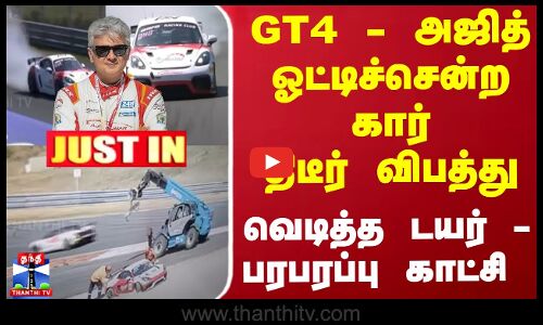 கார் பந்தயம் - நடிகர் அஜித் கார் டயர் வெடித்தது/GT4 கார் பந்தயத்தில் நடிகர் அஜித்குமாரின் கார் டயர் வெடித்தது/நெதர்லாந்தில் நடைபெற்று வரும் GT4 ஐரோப்பிய தொடரில் நடிகர் அஜித் பங்கேற்றுள்ளார்/இந்த பந்தயத்தில் நடிகர் அஜித்குமார் ஓட்டிய கார் டயர் வெடித்தது/கார் ட்ராக் சர்க்யூட்டில் நின்ற பிறகு, டயர் மாற்றப்பட்டு மீண்டும் பந்தயத்தில் அஜித் பங்கேற்றார்