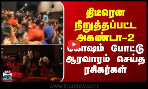 திரையரங்கில் நிறுத்தப்பட்ட அகண்டா 2 படம் - ரசிகர்கள் கோஷம். தெலுங்கானா மாநிலம் மியாபூரில் உள்ள திரையரங்கில் தொழில்நுட்பக் கோளாறால் அகண்டா-2 திரைப்படம் நிறுத்தப்பட்ட நிலையில் படம் பார்க்க வந்த ரசிகர்கள் 'ஜெய் பாலய்யா' என கூறி திரையரங்கில் ஆரவாரம் செய்தனர். இந்த வீடியோ இணையத்தில் வேகமாக பரவி வருகிறது.