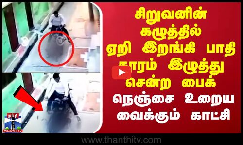 சிறுவனின் கழுத்தில் ஏறி இறங்கி பாதி தூரம் இழுத்து சென்ற பைக்.. உறைய வைக்கும் காட்சி