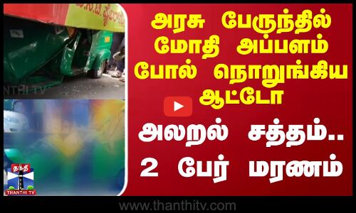 அரசு பேருந்தில் மோதி அப்பளம் போல் நொறுங்கிய ஆட்டோ - அலறல் சத்தம்.. 2 பேர் மரணம்