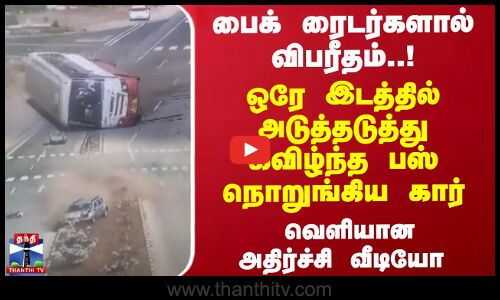பைக் ரைடர்களால் விபரீதம்..! ஒரே இடத்தில் அடுத்தடுத்து கவிழ்ந்த பஸ் நொறுங்கிய கார்..