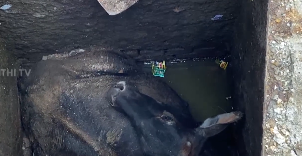 கழிவுநீர் கால்வாயில் விழுந்த பசு - 8 மணி நேரத்திற்கு பின் மீட்பு