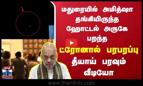 மதுரையில் மத்திய உள்துறை அமைச்சர் அமித்ஷா தங்கியுள்ள தங்கும் விடுதி அருகே தடையை மீறி நீண்ட நேரமாக ட்ரோன் பறந்ததால் பரபரப்பு ஏற்பட்டது. அமித்ஷாவின் மதுரை வருகையையொட்டி, பலத்த பாதுகாப்பு போடப்பட்டுள்ளது. அவர் தங்கியுள்ள விடுதி அருகே, மாவட்ட ஆட்சியரின் தடை உத்தரவை மீறி ட்ரோன் பறந்ததால் பெரும் பரபரப்பு ஏற்பட்டது. பாதுகாப்புப் பணியில் இருந்த காவல்துறையினர் விரைந்து சென்றபோது, ட்ரோன் கீழே இறக்கப்பட்டுவிட்டது. இதுகுறித்து தீவிர விசாரணை நடைபெற்று வருகிறது.