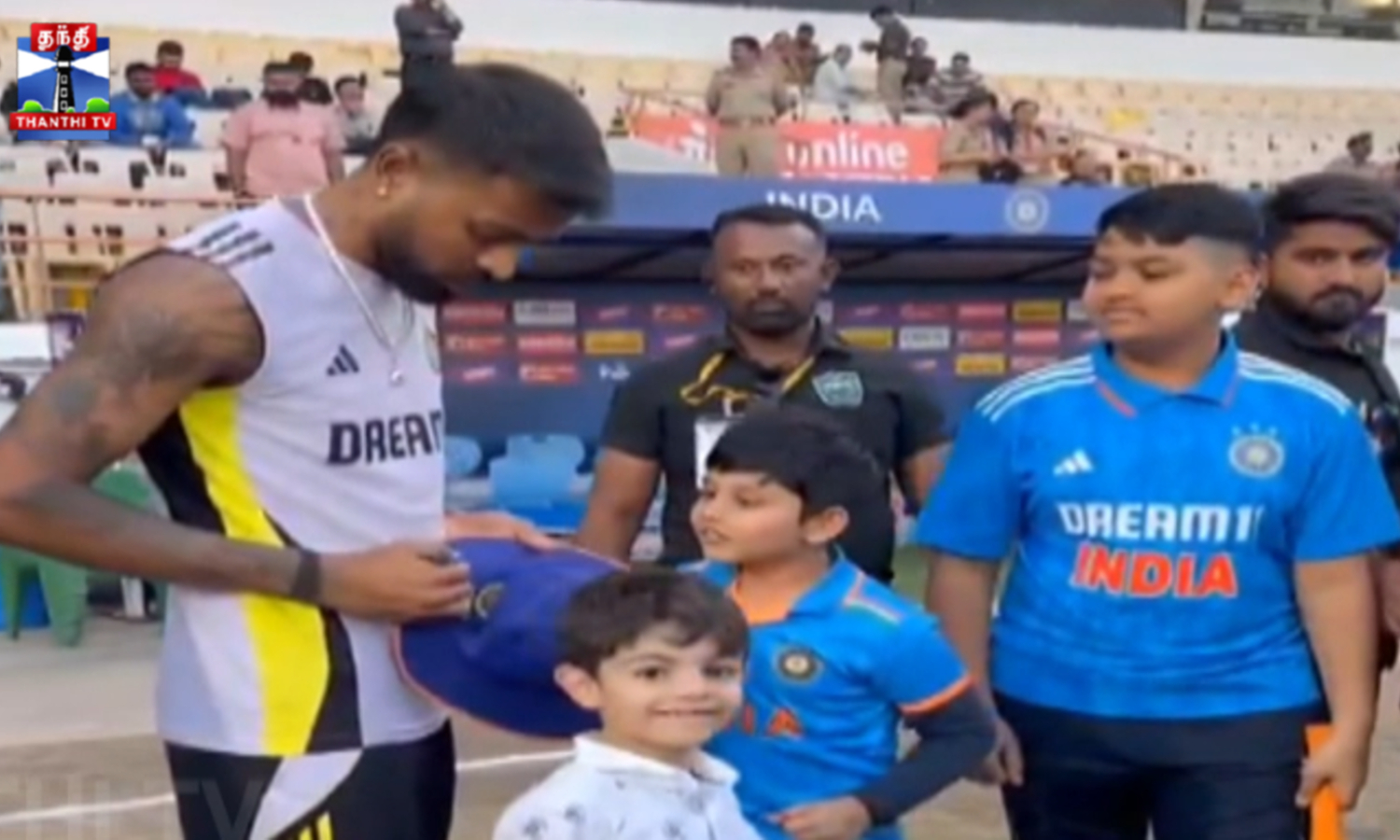 மூன்றாவது டி20 போட்டிக்காக ராஜ்கோட் மைதானத்தில் இந்திய, இங்கிலாந்து அணி வீரர்கள் தீவிர பயிற்சியில் ஈடுபட்டனர். இதனிடையே இந்திய வீரர் ஹார்திக் பாண்டியா, மைதானத்தில் இருந்த சிறுவர்களின் டி-ஷர்ட், தொப்பிகளில் கையொப்பமிட்டு, அவர்களுடன் புகைப்படம் எடுத்துக் கொண்டார்.