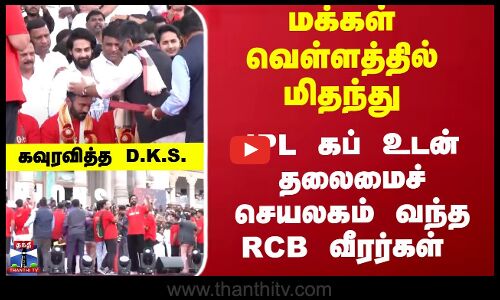 ஐபிஎல் கோப்பையை வென்ற ஆர்.சி.பி அணி பெங்களூருவில் வெற்றிப் பேரணியில் ஈடுபட்டுள்ள நிலையில், கோப்பையுடன் அந்த மாநில தலைமைச் செயலகத்திற்கு வீரர்கள் வந்தடைந்தனர்.