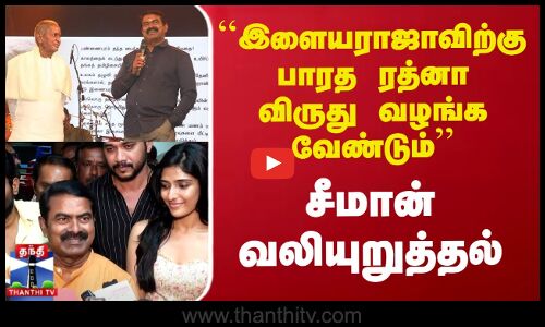 விருது ஒன்று கொடுத்தால் இளையராஜாவிற்கு பாரத ரத்னா விருது கொடுக்க வேண்டும் என்று நாம் தமிழர் கட்சியின் தலைமை ஒருங்கிணைப்பாளர் சீமான் தெரிவித்துள்ளார். சென்னையில் செய்தியாளர்களை சந்தித்த அவர், தமிழ் சினிமாவில் ஜாதியை போற்றி யாரும் படம் எடுப்பதில்லை, ஜாதியை தூற்றி தான் படம் எடுப்பதாக கூறினார். மேலும் எல்லாம் வியாபாரமயமான சூழ்நிலையில் கலைக்கு மட்டும் கட்டுப்பாடுகள் விதிப்பது சரியில்லை என தெரிவித்தார்.