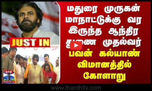 பவன் கல்யாண் வர இருந்த விமானத்தில் தொழில்நுட்பக் கோளாறு/ஆந்திர துணை முதல்வர் பவன் கல்யாண் மதுரைக்கு வர இருந்த விமானத்தில் தொழில்நுட்பக் கோளாறு/மதுரையில் இன்று பிற்பகல் தொடங்கும் முருகன் மாநாட்டில் பங்கேற்கும் பவன் கல்யான்/ஹைதராபாத்தில் பவன் கல்யாண் புறப்பட இருந்த தனி விமானம் தொழில்நுட்பக் கோளாறு காரணமாக நிறுத்தம்/விமானத்தில் தொழில்நுட்பக் கோளாறு ஏற்பட்டதால் பவன் கல்யாண் மதுரை வருவது தாமதமாக வாய்ப்பு