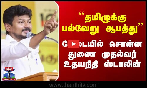 தமிழுக்கும், தமிழர்களுக்கும் பெரிய ஆபத்தைக் கொண்டு வர நினைக்கிறார்கள் என குற்றம் சாட்டியுள்ள துணை முதல்வர் உதயநிதி ஸ்டாலின், மாணவர்கள் மத்திய அரசின் சூழ்ச்சிகளை புரிந்து கொண்டால் எதிரியை வெல்லலாம் எனத் தெரிவித்துள்ளார். சென்னை நந்தனம் அரசு கலை கல்லூரியில் கலைஞர் கலையரங்கத்தை திறந்து வைத்து பேசிய அவர், இதனைத் தெரிவித்தார்.