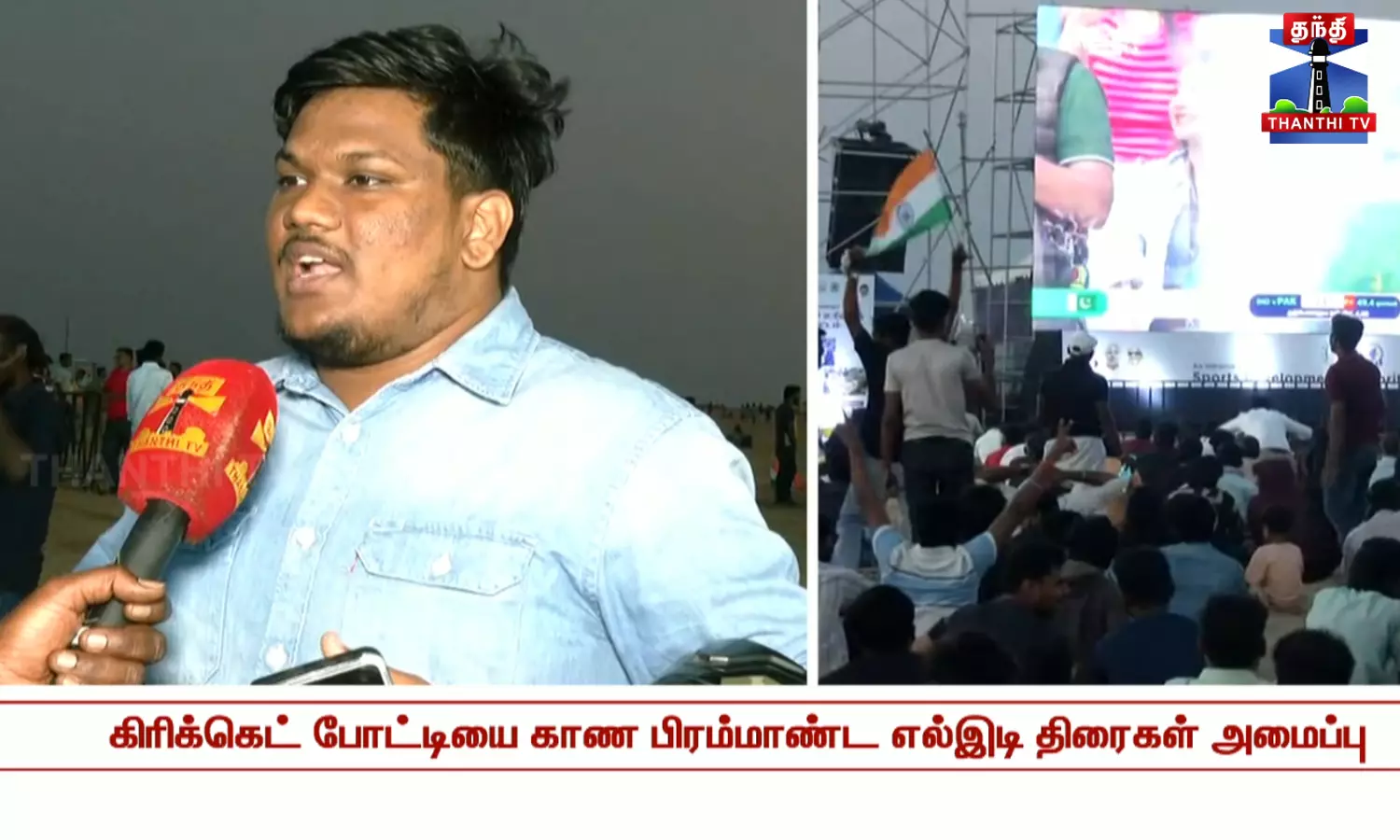 இந்தியா - பாகிஸ்தான் கிரிக்கெட் போட்டியை காணும் வகையில் சென்னை மெரினா மற்றும் பெசன்ட் நகர் கடற்கரைகளில் பிரம்மாண்ட எல்இடி திரைகள் அமைக்கப்பட்டுள்ள நிலையில், ரசிகர்கள் ஆர்வமுடன் பார்த்து வருகின்றனர்...